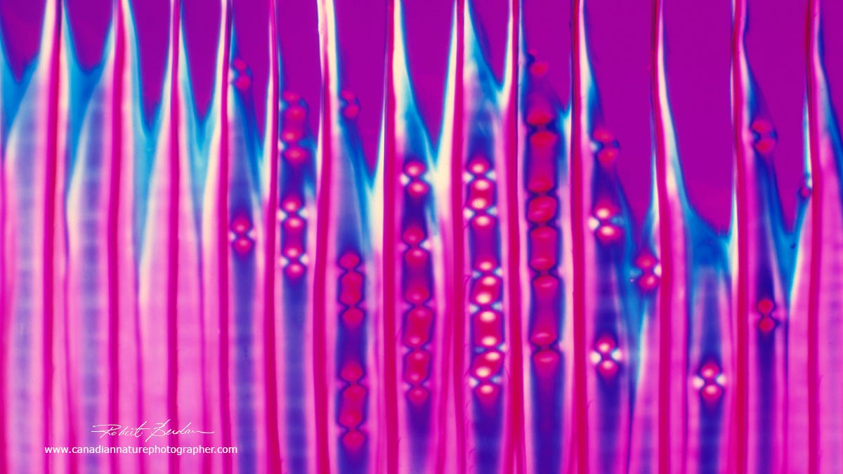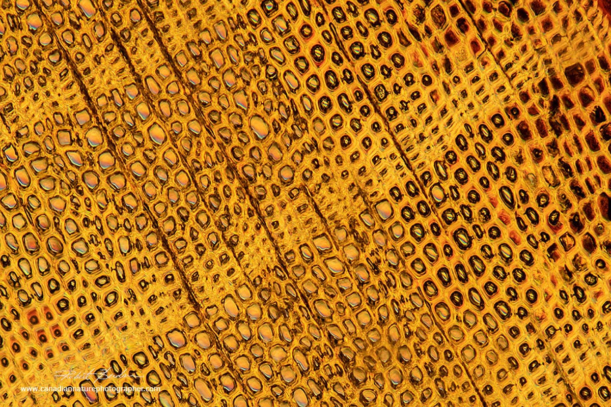 Section through a Hardwood Tree from a prepared microscope slide. Polarized light microscopy 200X (Source: Dr. Robert Berdan, The Canadian Nature Photographer)