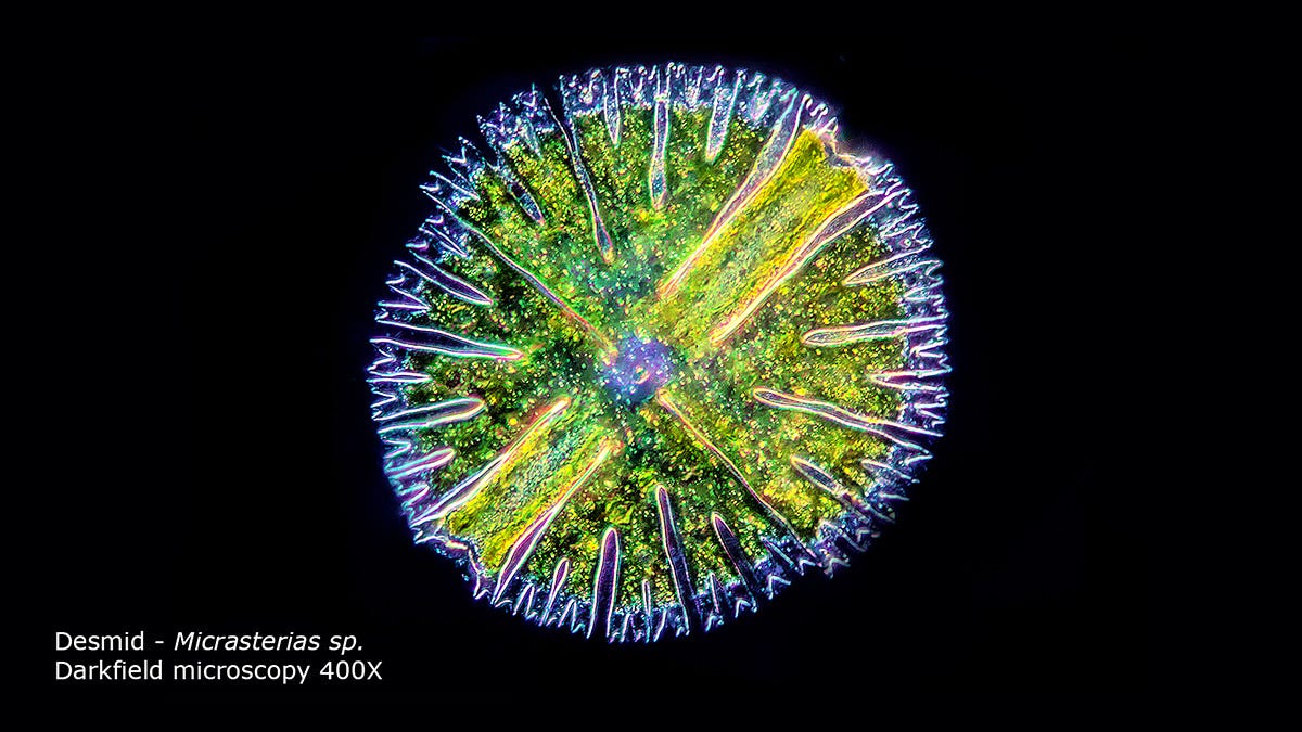 Desmids single-celled algae considered to be one of the earliest evolved plants. Top Closterium sp DIC microscopy 400X and the bottom Micrasterias sp Dark-field microscopy. (Dr. Robert Berdan, The Canadian Nature Photographer)